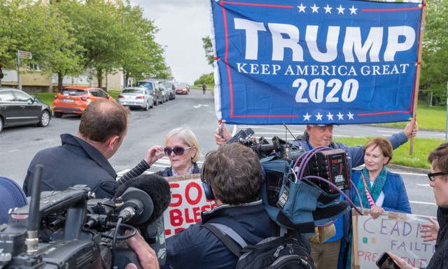 Photographer: Steve Ford Shannon, Ireland, June. 5, 2019: A man with a placard protesting against the Donald Trump visit at Shannon Airport, Ireland 3 today