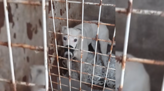 The animals can be seen wearing “anti-bark” muzzles which prevent them from drinking and panting as well as from barking.
