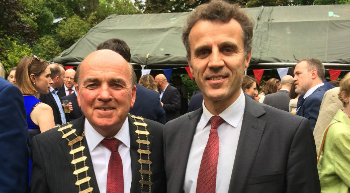Photo (c) Clare County Council. Clare County Council was represented by the Cathaoirleach at the French Embassy in Ireland's Bastille Day celebration at Fitzwilliam Lane in Dublin on Friday evening (14 July). Pictured is Councillor Tom McNamara, Cathaoirleach of Clare County Council, with H.E. Mr Stéphane Crouzat, Ambassador of France in Ireland.